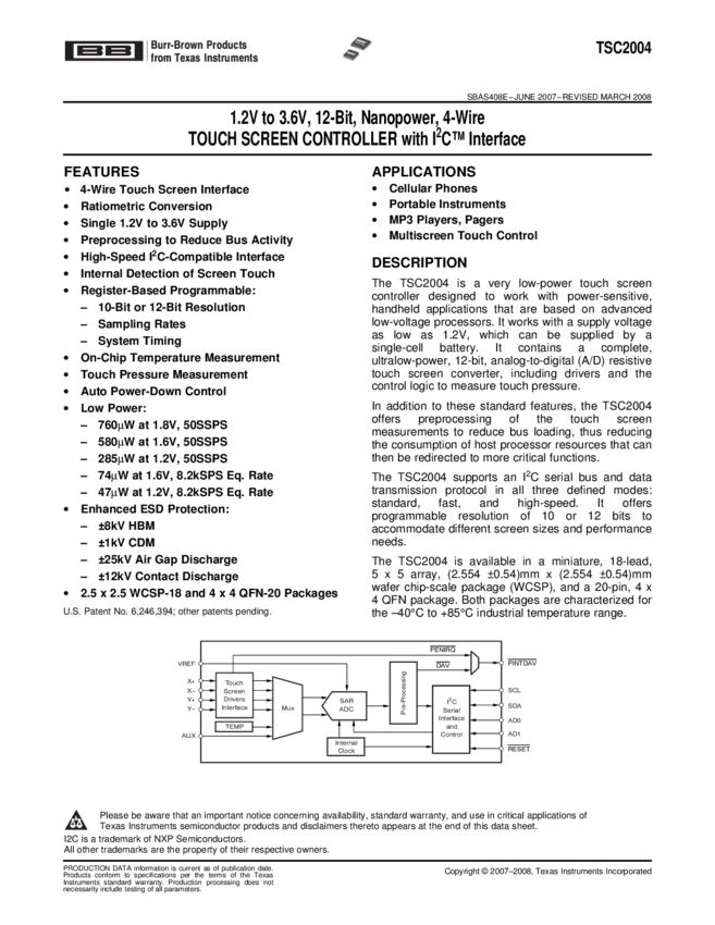 TSC2004IRTJR Touch Screen Controller 20-Pin WQFN EP T/R
