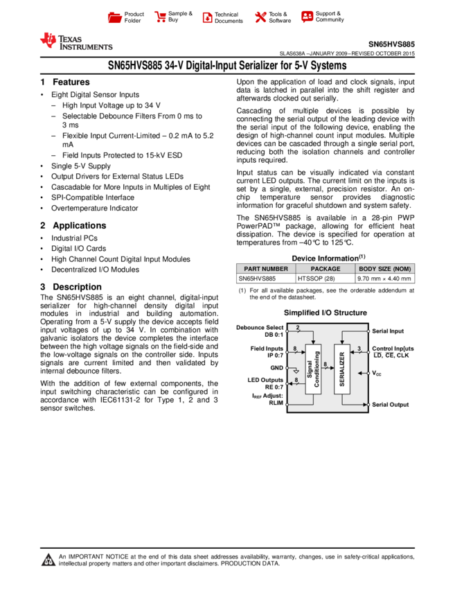 SN65HVS885PWPR Digital Input Serializer 28-Pin HTSSOP EP T/R