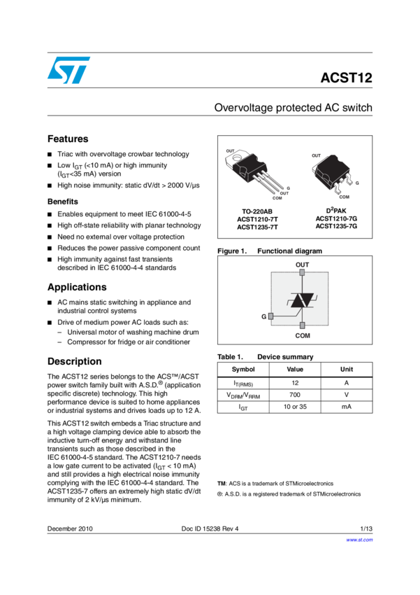 ACST1210-7GTR Thyristor TRIAC 700V 126A 3-Pin(2+Tab) D2PAK T/R