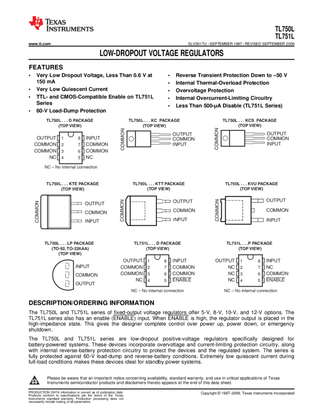 TL751L05CDR, TL751L12CDR, TL750L05CD, TL750L05CKTTR