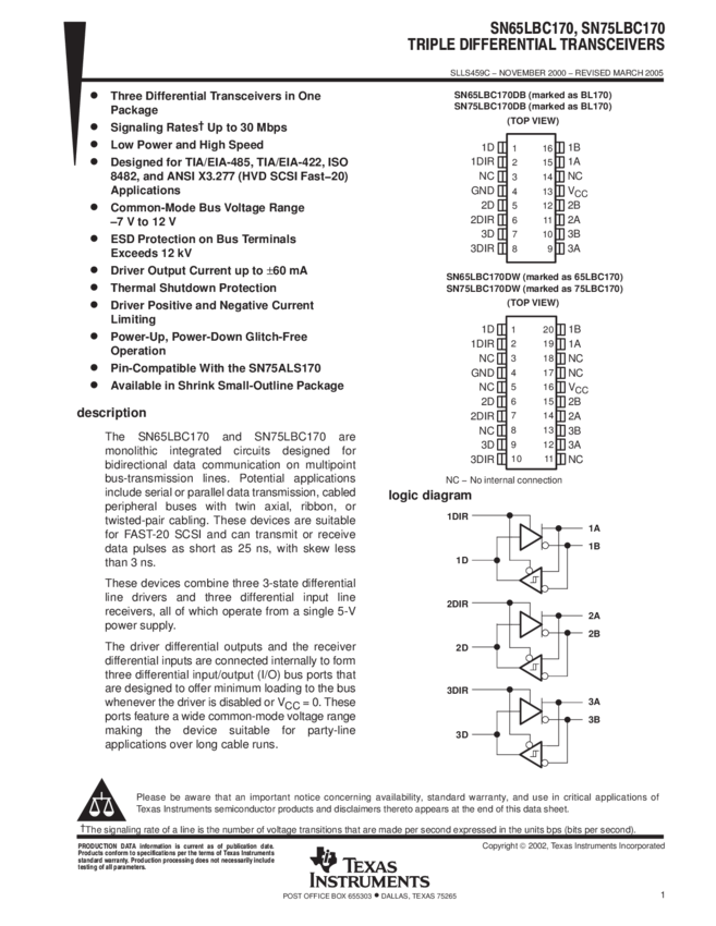 SN65LBC170DBR Triple Transmitter/Receiver RS-422/RS-485 16-Pin SSOP T/R