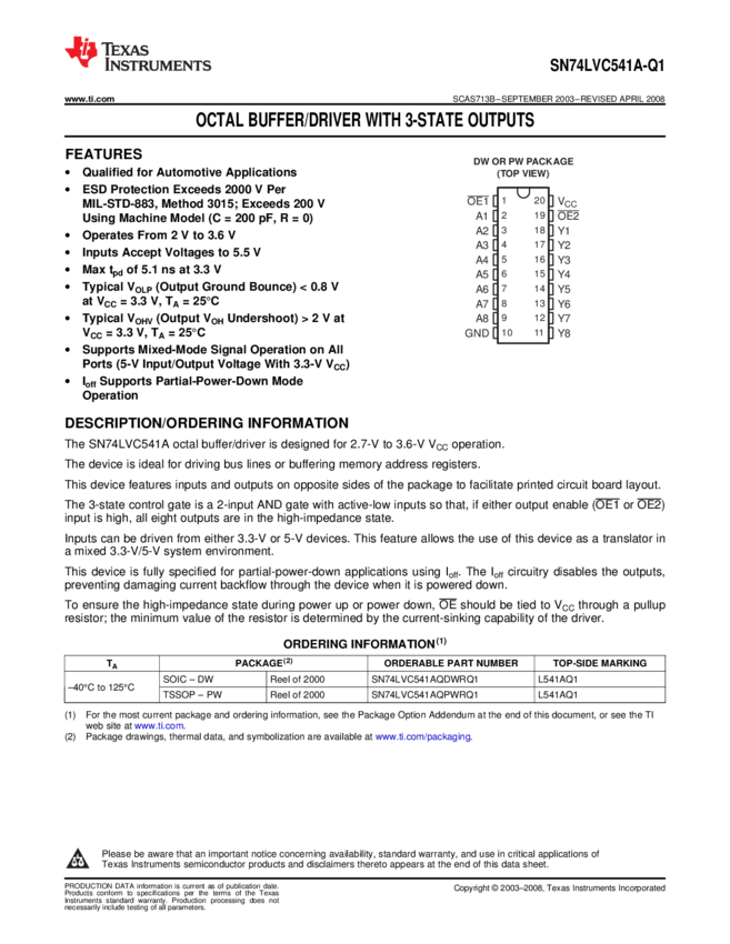 SN74LVC541AQPWRQ1 Buffer/Line Driver 8-CH Non-Inverting 3-ST CMOS 20-Pin TSSOP T/R