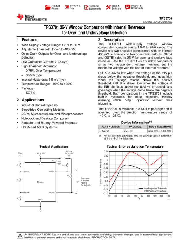 TPS3701DDCR Comparator Dual 36V 6-Pin SOT T/R