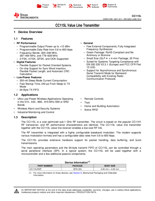 CC115LRGPR RF Transmitter FSK/GFSK/OOK 2.5V/3.3V 20-Pin QFN T/R