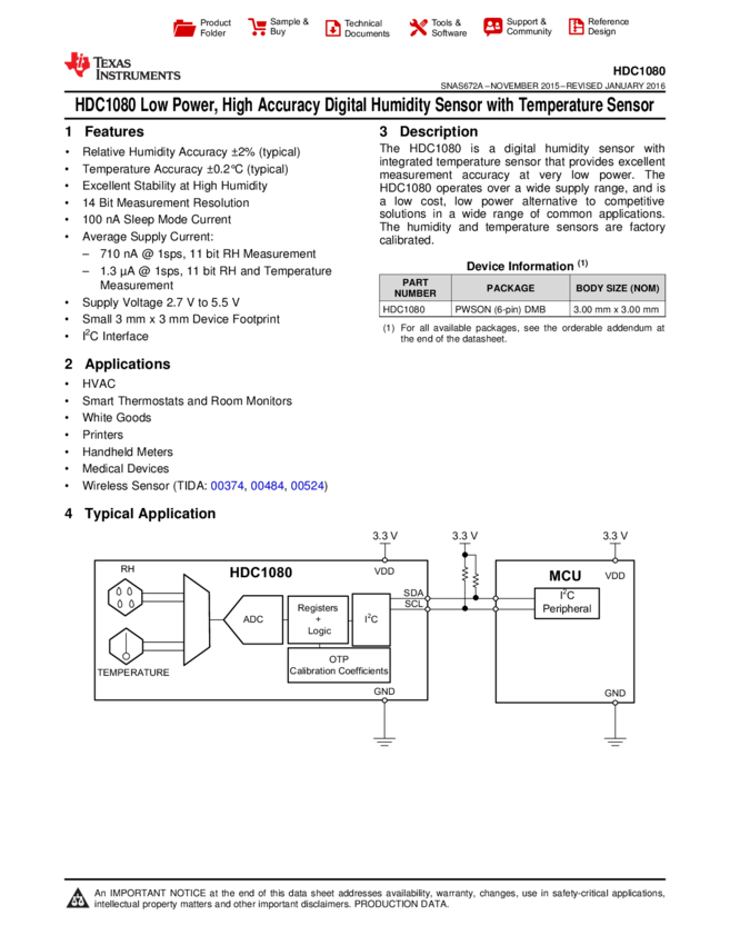 HDC1080DMBT Digital Humidity Sensor 6-Pin PWSON T/R
