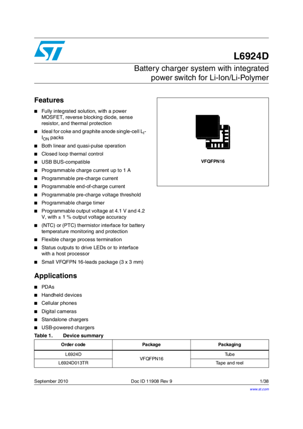 L6924D013TR Battery Charger Li-Ion/Li-Pol 30mA 4.1V 16-Pin VFQFPN EP T/R