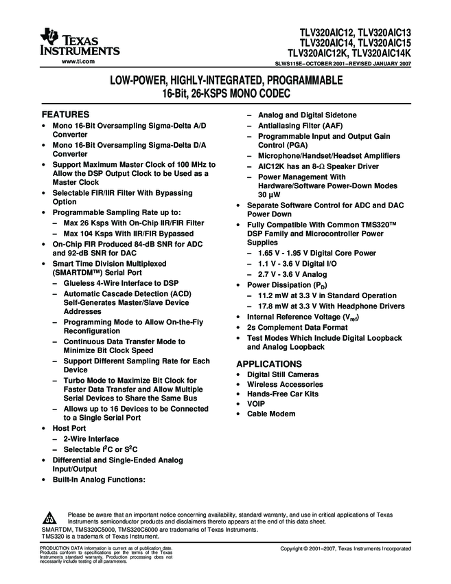 TLV320AIC12KIRHBR, TLV320AIC12KIDBTR, TLV320AIC12KIRHBT
