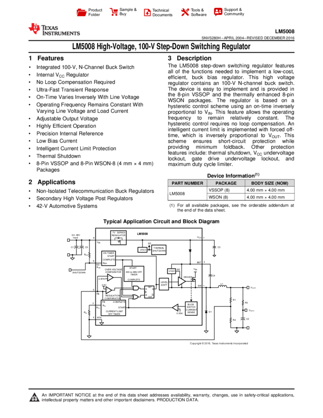 LM5008MMX/NOPB Conv DC-DC Single Step Down 9.5V to 95V 8-Pin MSOP T/R