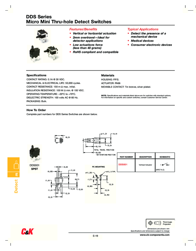DDS003 Electromechanical Switch Detect Switch N.O. SPST 0.1A Bulk