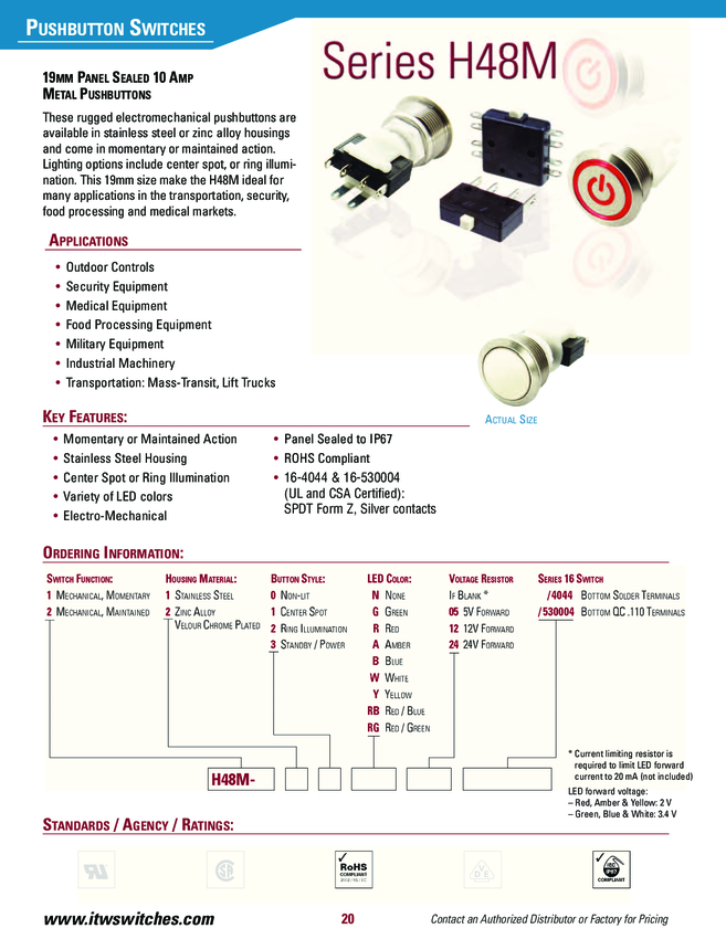H48M-212B24 Switch Push Button SPDT Round Button 10A 250VAC 28VDC Maintained Contact So...