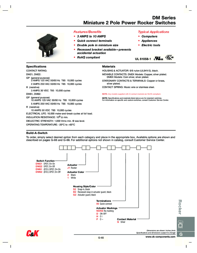 DM14J72S205Q3 Switch Rocker ON OFF SPST Quick Connect Curved Rocker 3A 250VAC