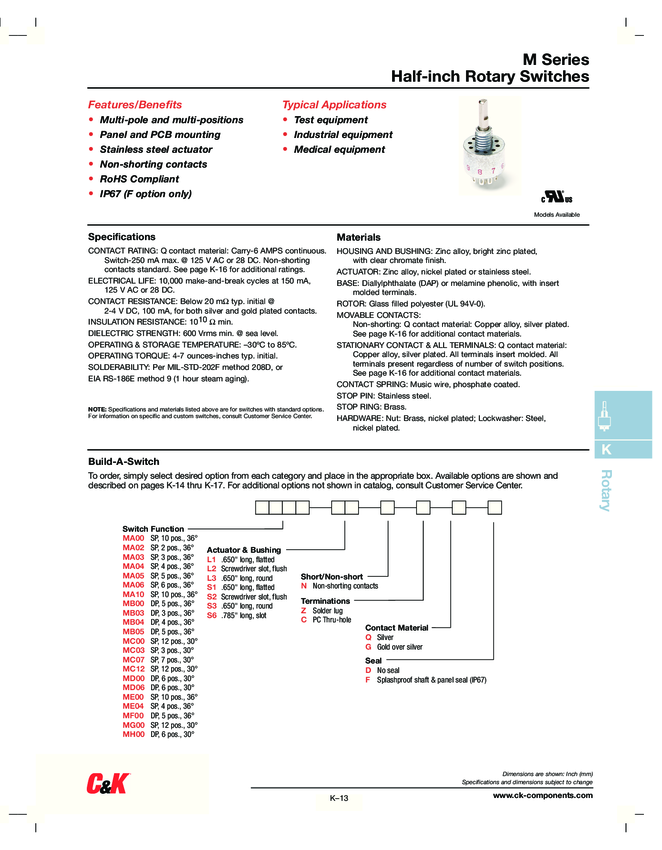 MA10L3NZGD Switch Rotary SP10T 10 Flatted Shaft PC Pins 0.25A 125VAC 28VDC