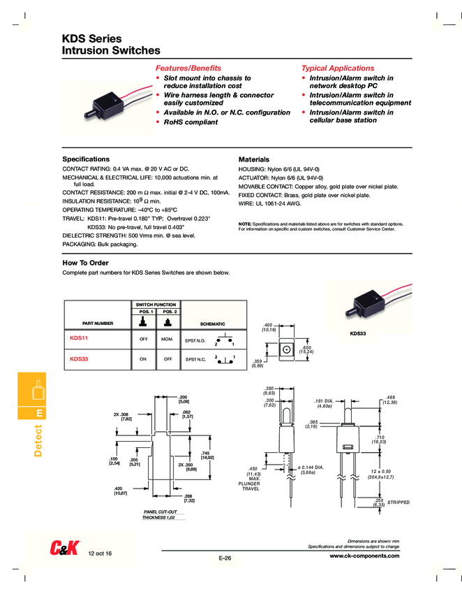 KDS11 Electromechanical Switch Intrusion Switch OFF Mom SPST Bulk