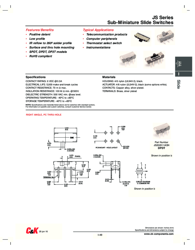 JS102011SAQN Switch Slide DPDT Side Slide 0.3A 6VDC PC Pins Thru-Hole
