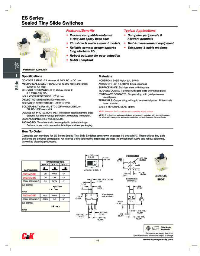 ES03MSABE Switch Slide ON None ON SPDT Top Slide 20VAC 20VDC 0.4VA 40000Cycle PC Pins...