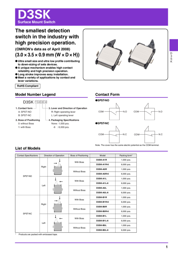 D3SK-A0R Smallest Detection Switch with High Precision Operation Embossed T/R