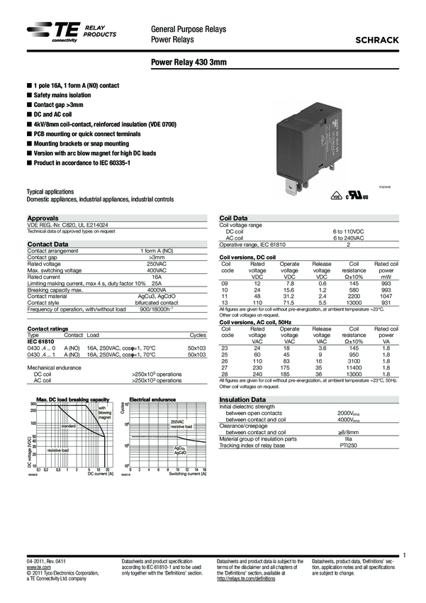 8-1415363-1 Electromechanical Relay SPST-NO 16A 240VAC 13KOhm