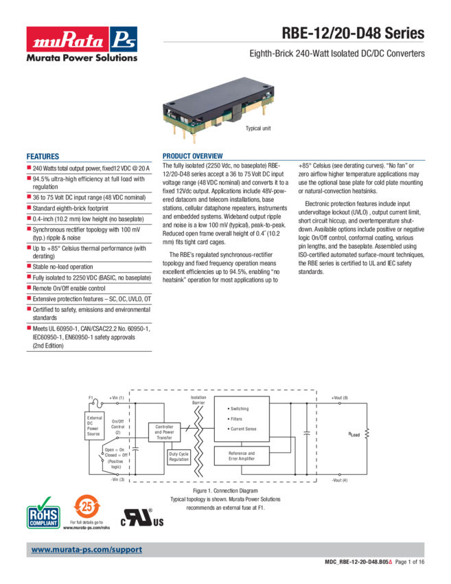 RBE-12/20-D48PH-C Conv DC-DC Single Step Down 36V to 75V 5-Pin 1/8-Brick