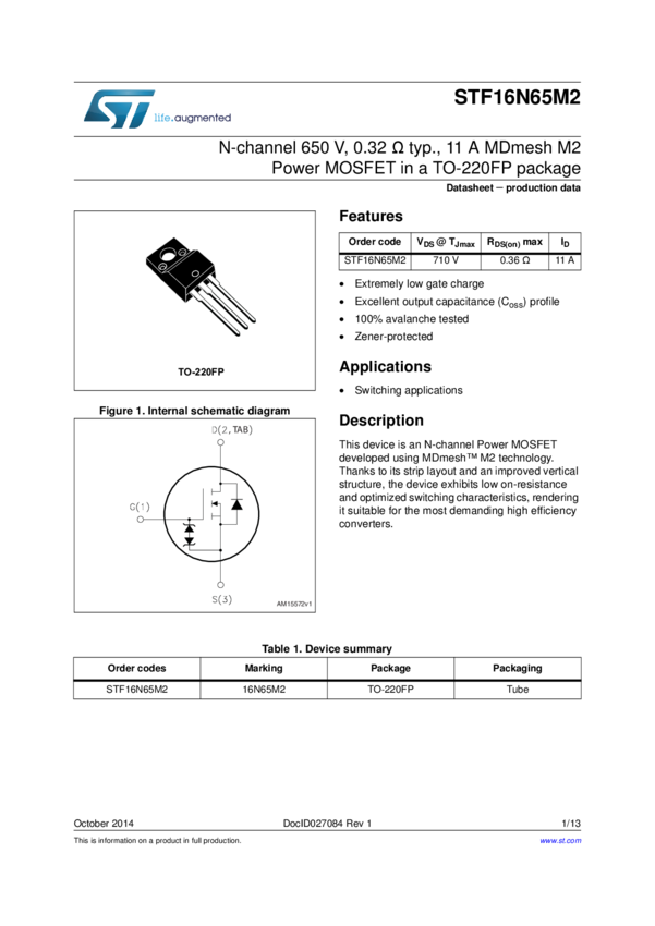 STF16N65M2 Trans MOSFET N-CH 710V 11A 3-Pin TO-220FP Tube