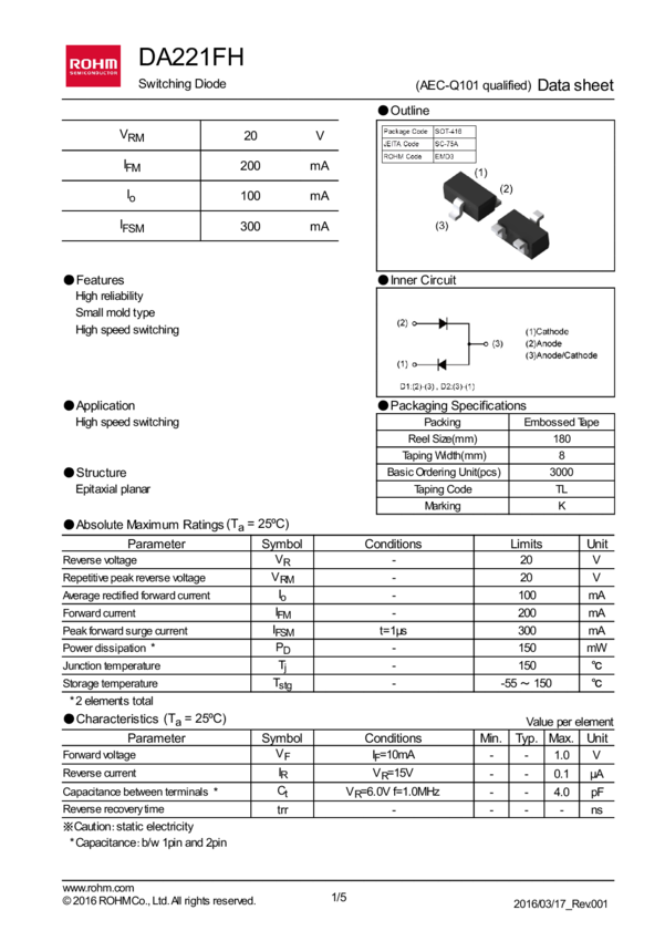 DA221FHTL Diode Switching Diode 20V 0.1A 3-Pin EMD T/R