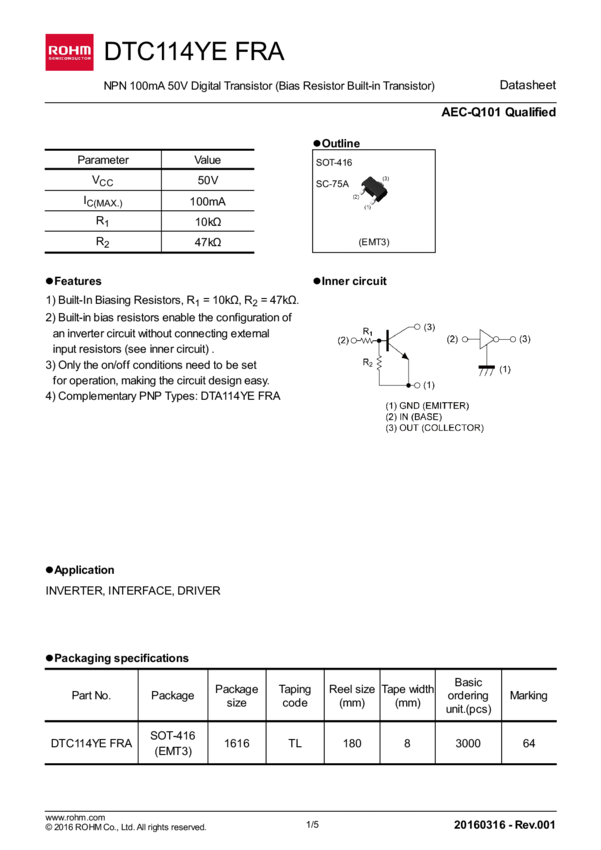 DTC114YEFRATL Trans Digital BJT NPN 100mA 3-Pin SOT-416 T/R
