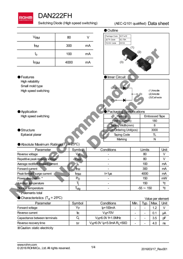 DAN222FHTL Diode Switching Diode 80V 0.1A 3-Pin EMD T/R