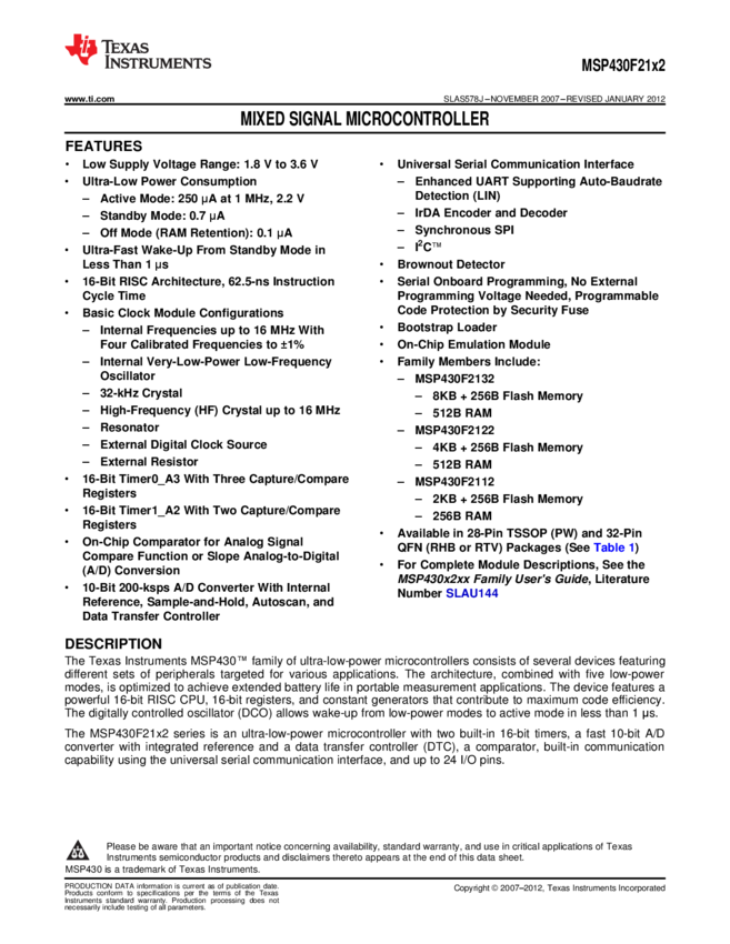 MSP430F2122TRTVT MCU 16-bit MSP430 RISC 4KB Flash 2.5V/3.3V 32-Pin WQFN EP T/R