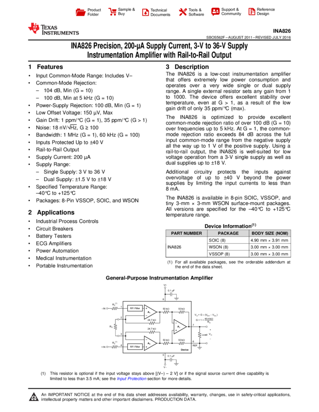 INA826AIDRGT SP Amp INSTR Amp Single R-R O/P ±18V/36V 8-Pin WSON EP T/R