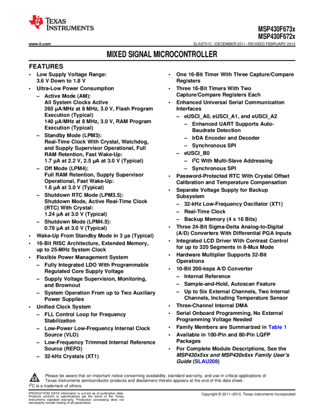 MSP430F6736IPZR MCU 16-bit MSP430 RISC 128KB Flash 2.5V/3.3V 100-Pin LQFP T/R