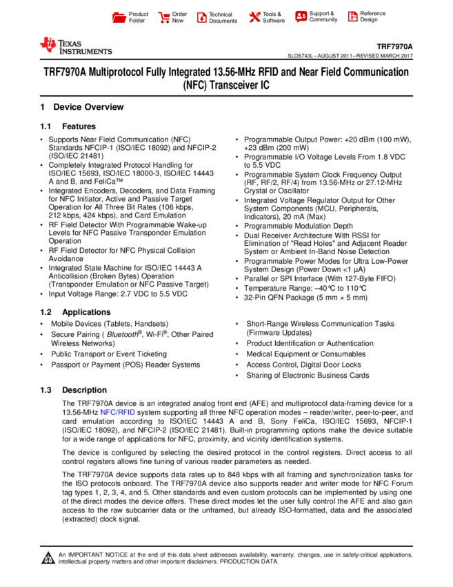 TRF7970ARHBT Transceiver IC 1TX 2RX 848Kbps 32-Pin VQFN EP T/R