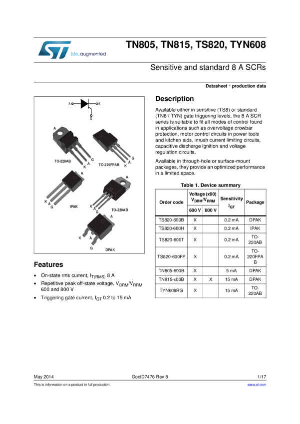 TN805-600B-TR Thyristor SCR 600V 73A 3-Pin(2+Tab) DPAK T/R