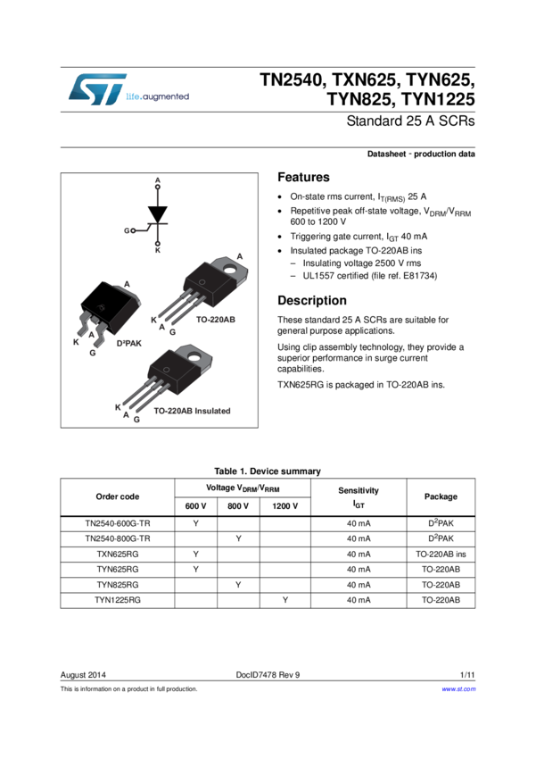 TN2540-600G-TR Thyristor SCR 600V 314A 3-Pin(2+Tab) D2PAK T/R