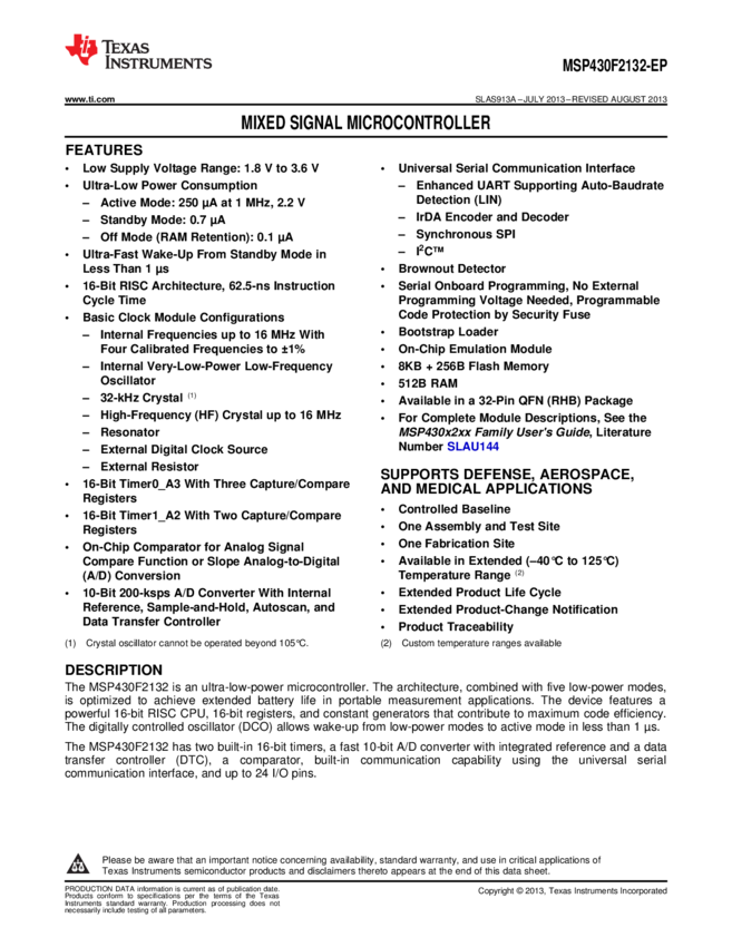 MSP430F2132QRHBTEP MCU 16-Bit MSP430 RISC 8KB Flash 2.5V/3.3V 32-Pin VQFN T/R