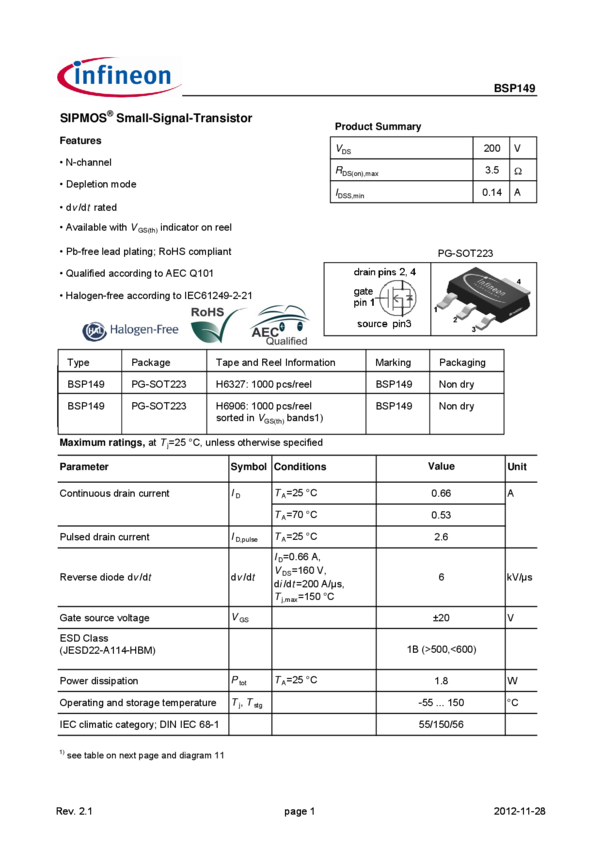 BSP149H6327XTSA1 Trans MOSFET N-CH 200V 0.66A 4-Pin SOT-223 T/R