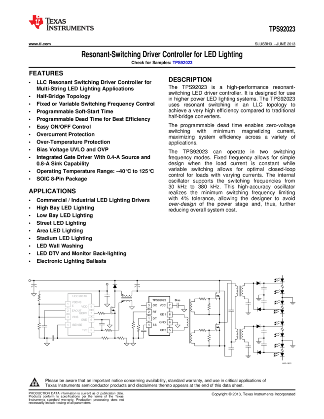 TPS92023DR LED DRVR Resonant 1-CH Analog 300V 5A 8-Pin SOIC T/R