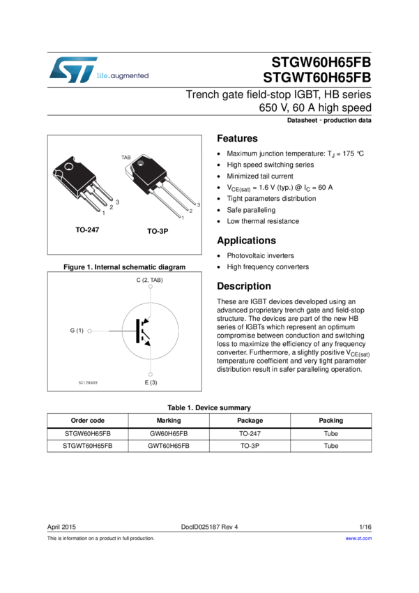STGWT60H65FB Trans IGBT Chip N-CH 650V 80A 3-Pin TO-3P Tube