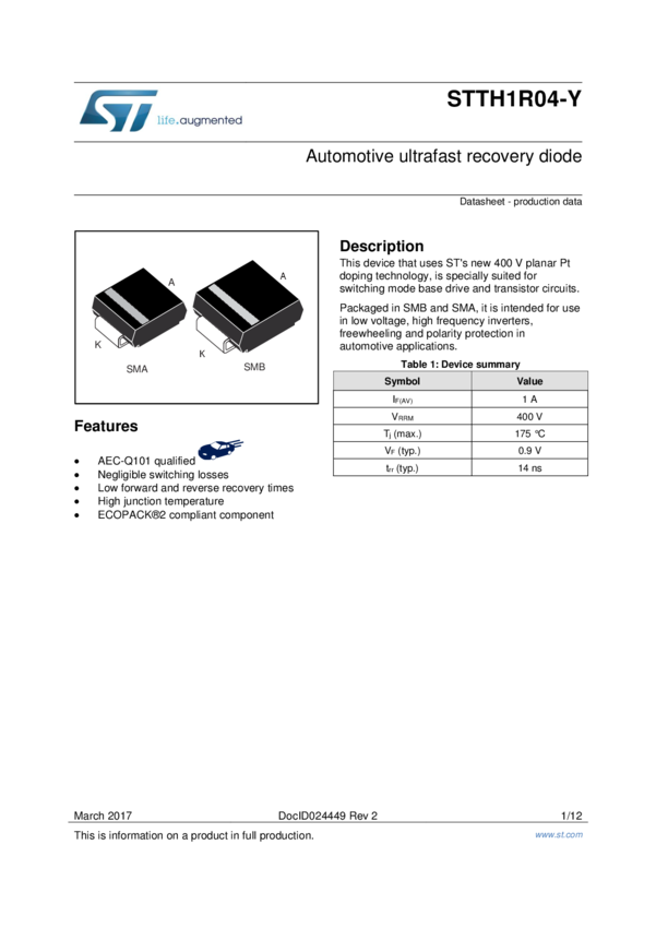 STTH1R04UY Diode Ultra Fast Recovery 400V 1A 2-Pin SMB T/R