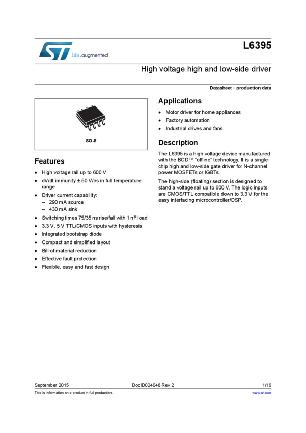 L6395DTR MOSFET DRVR 0.43A 2-OUT Hi/Lo Side Non-Inv 8-Pin SO T/R