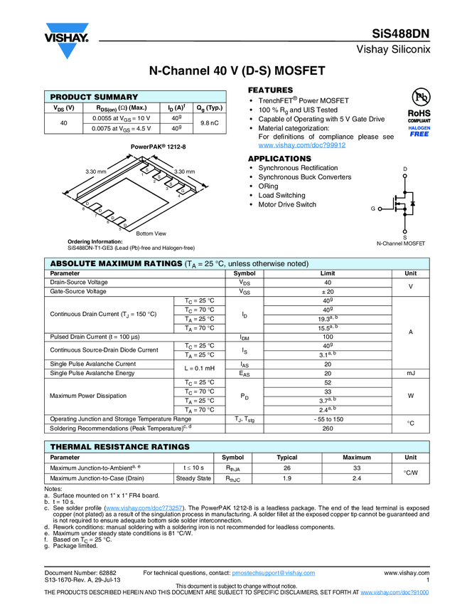 SIS488DN-T1-GE3 Trans MOSFET N-CH 40V 19.3A 8-Pin PowerPAK 1212 T/R