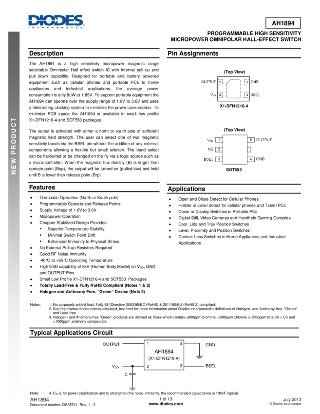 AH1894-Z-7 Hall Effect Sensor 3.5mA Omnipolar 1.85V/3V 5-Pin 5SOT-553 T/R