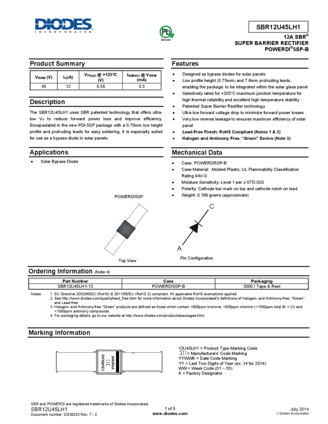 SBR12U45LH1-13 Diode Switching 45V 12A 2-Pin PowerDI 5SP T/R