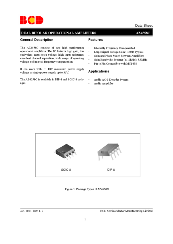 AZ4558CP-E1 OP Amp Dual GP ±18V/36V 8-Pin DIP Tube