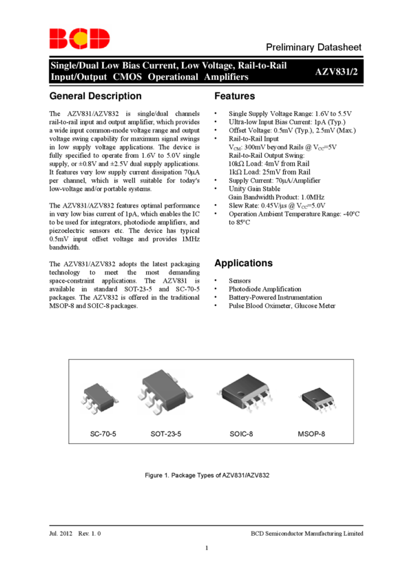 AZV831KTR-G1 OP Amp Single GP R-R I/O ±2.5V/5.5V 5-Pin SOT-23 T/R
