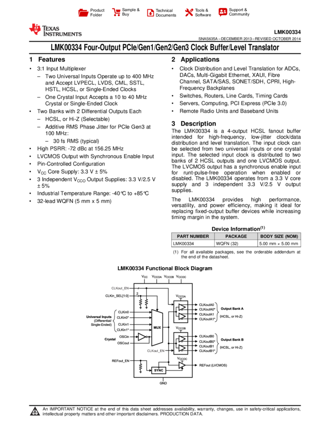 LMK00334RTVR Clock Driver CML/HCSL/HSTL/LVCMOS/LVDS/LVPECL/SSTL/XTAL 32-Pin WQFN EP T/R