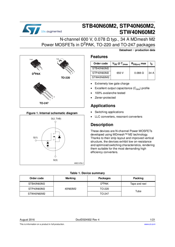 STB40N60M2 Trans MOSFET N-CH 650V 34A 3-Pin D2PAK T/R