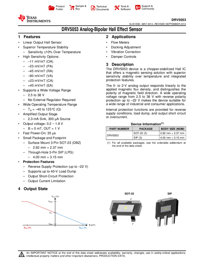 PDRV5053EAQLPG Hall Effect Sensor 2.3mA Bipolar 2.5V to 38V 3-Pin TO-92 T/R