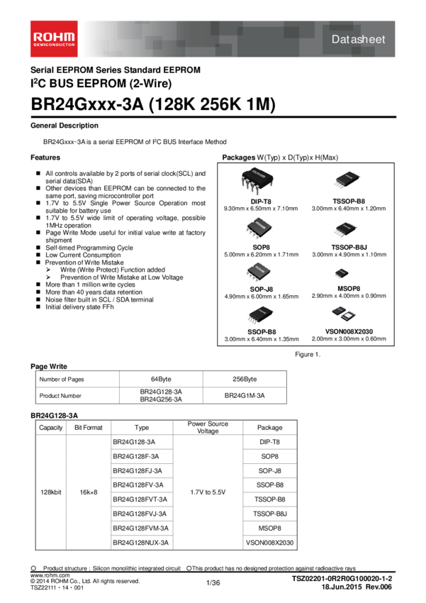 BR24G1MF-3AGTE2 EEPROM Serial-I2C 1M-bit 128K x 8 1.8V/2.5V/3.3V/5V 8-Pin SOP T/R