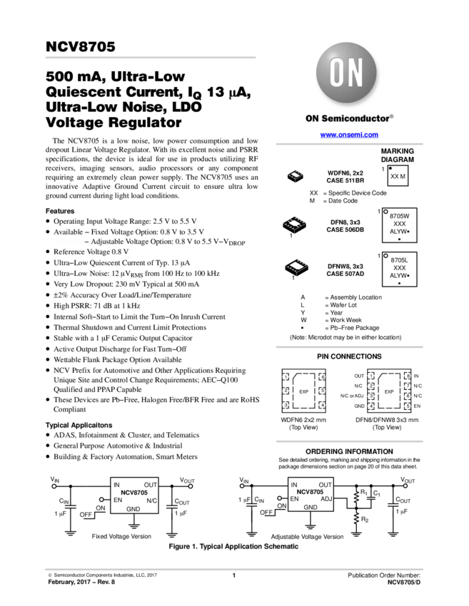 NCV8705MT33TCG LDO Regulator Pos 3.3V 0.5A 6-Pin WDFN T/R