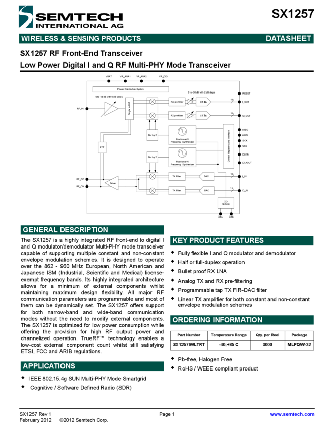 SX1257IWLTRT RF Transceiver 3.3V 32-Pin MLPQ-W T/R