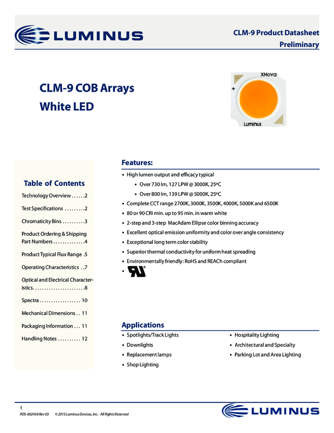 CLM-9-50-80-36-AC00-F2-3 LED Uni-Color White 800lm 5000K Chip LED 2-Pin SMD Tray